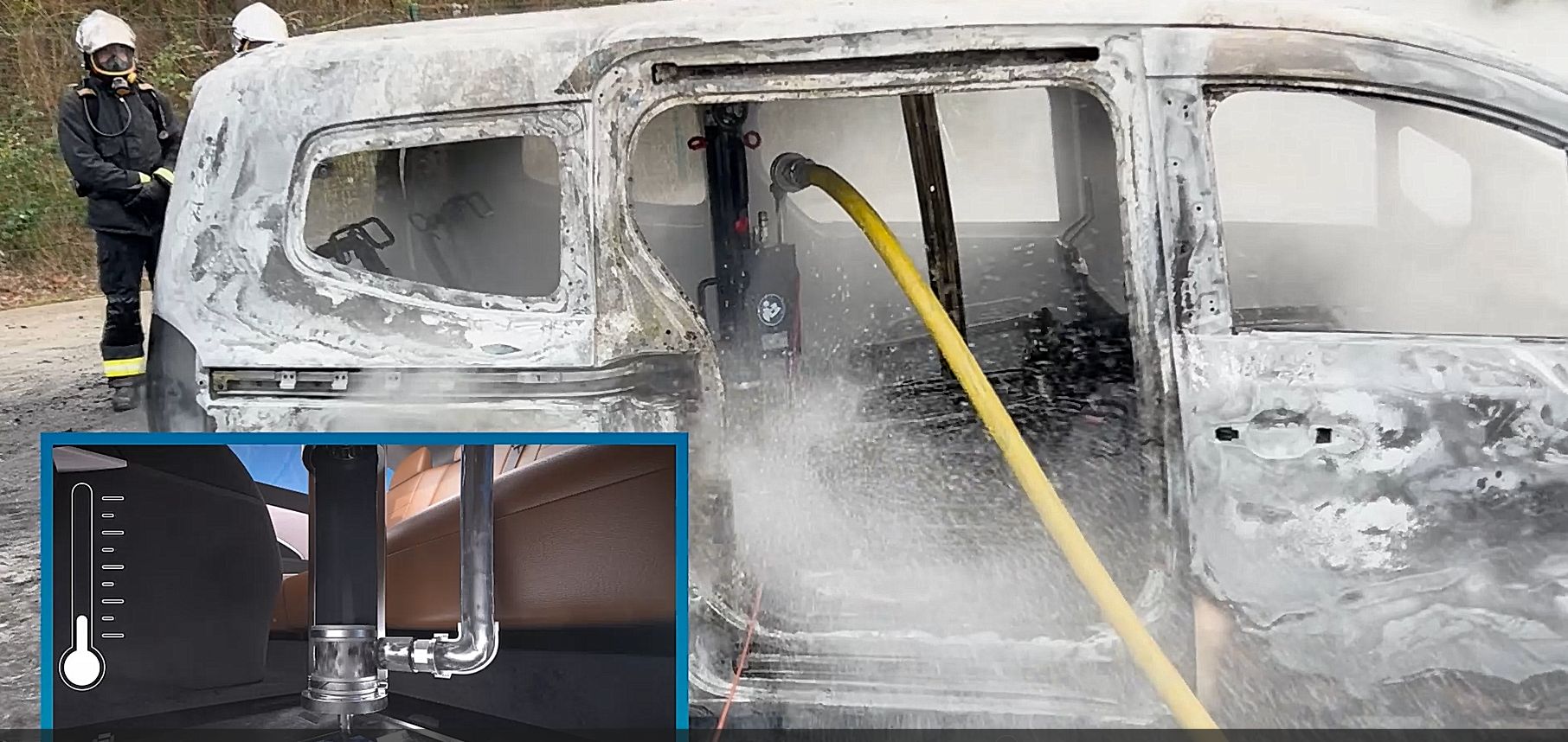 Facile à utiliser, il limite également l’impact environnemental grâce à une consommation minimale d’eau, ciblant directement la source de l’incendie : la batterie. Développé dans le secteur automobile, ce système d’extinction compact et robuste s’adapte à de nombreuses situations